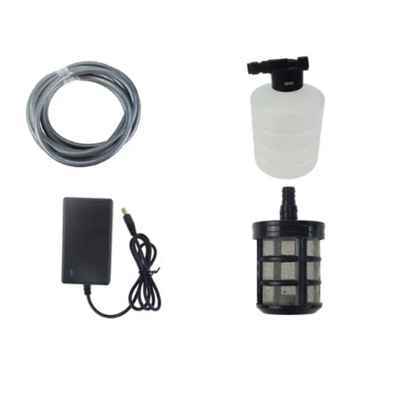 - В комплект входять: акумуляторна батарея, зарядний пристрій, муфта швидкороз'ємна 1/4", впускний шланг 5 м, насадка 0°, насадка 40°, фільтр, контейнер для миючого засобу, кейс для перенесення, інструкція