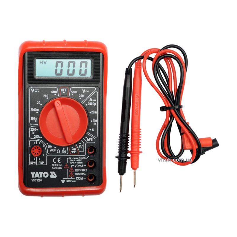 Мультиметр YATO YT-73080 працює від батареї 9В (6F22), що забезпечує тривалий час роботи. У комплекті з пристроєм поставляються вимірювальні зонди, гумовий кожух для захисту від пошкоджень та інструкція з експлуатації.