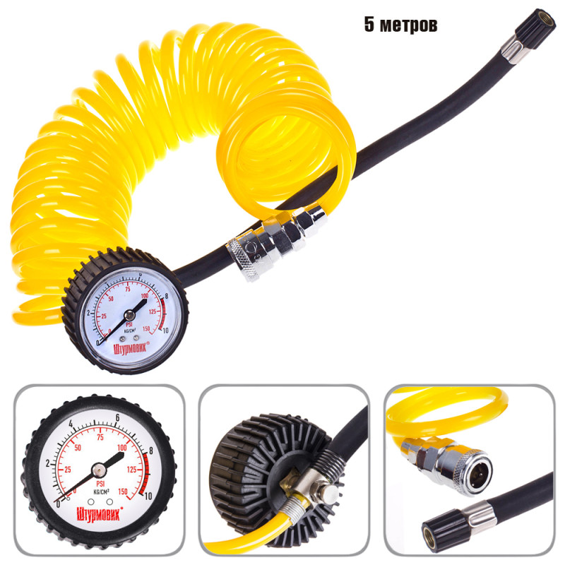 Повітряний спіральний шланг Штурмовик АС-104 з довжиною 5,0 м — універсальний інструмент для роботи з автомобільними компресорами та пневмоінструментом. Він оснащений вбудованим манометром та дефлятором, що дозволяє не тільки швидко накачувати шини, але й точно контролювати тиск та за необхідності знижувати його. Гнучка спіральна конструкція забезпечує комфортне розгортання в гаражі або на станціях технічного обслуговування, а також компактне зберігання в багажнику автомобіля. Надійні фітинги та міцне з'єднання створюють герметичну систему на кожен робочий день.