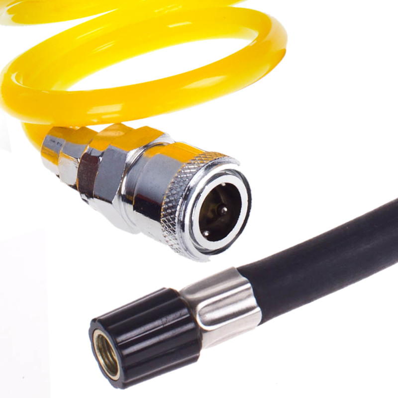 1) Підключайте шланг до компресора через штатний фітінг. 2) Подайте повітря і слідкуйте за показаннями манометра, щоб зафіксувати потрібний тиск у шині чи інструменті. 3) За потреби використовуйте дефлятор для плавного зниження тиску. 4) Після роботи акуратно змотайте шланг і приберіть його в зручному місці - спіральна конструкція не зламається і не займе багато місця. Ці прості кроки дозволяють швидко та безпечно обслуговувати автомобільні колеса та проводити роботу з пневмоінструментом.