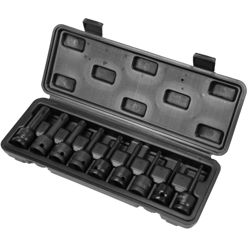- 9 предметов в одном наборе: охватывает диапазон размеров T20–T70 для большинства TORX-резьбовых соединений.