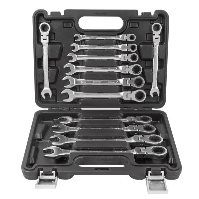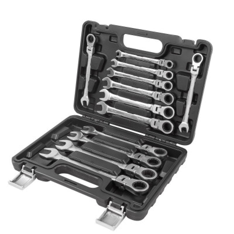 - Комплектация: 12 комбинированных трещоточных ключей с шарниром, подходящих для различных размеров гаечных головок.