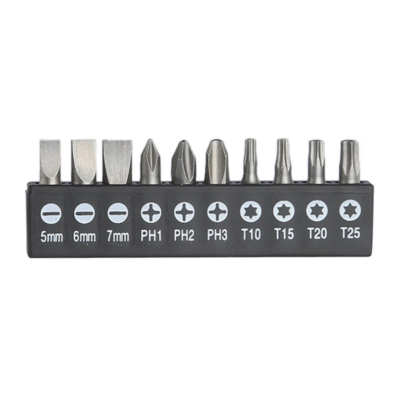- Разнообразие бит: В комплект входят 12 различных бит, что позволяет работать с различными типами крепежа: PH, SL и Tx.