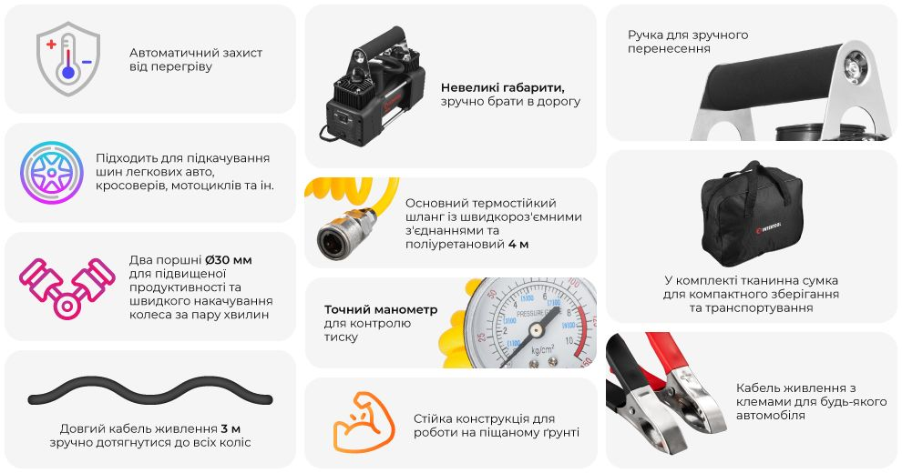 Незважаючи на свої потужні характеристики, компресор має компактні розміри, що дозволяє йому зручно розміщуватись у багажнику автомобіля. У комплекті йде спеціальна сумка для зберігання, що робить його транспортування ще зручнішим. Живлення здійснюється безпосередньо від автомобільного акумулятора за допомогою клем, а довжина кабелю живлення становить 3 метри , що дозволяє працювати з комфортом навіть у складних умовах.